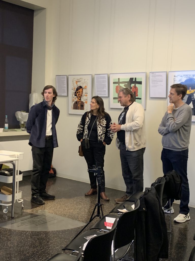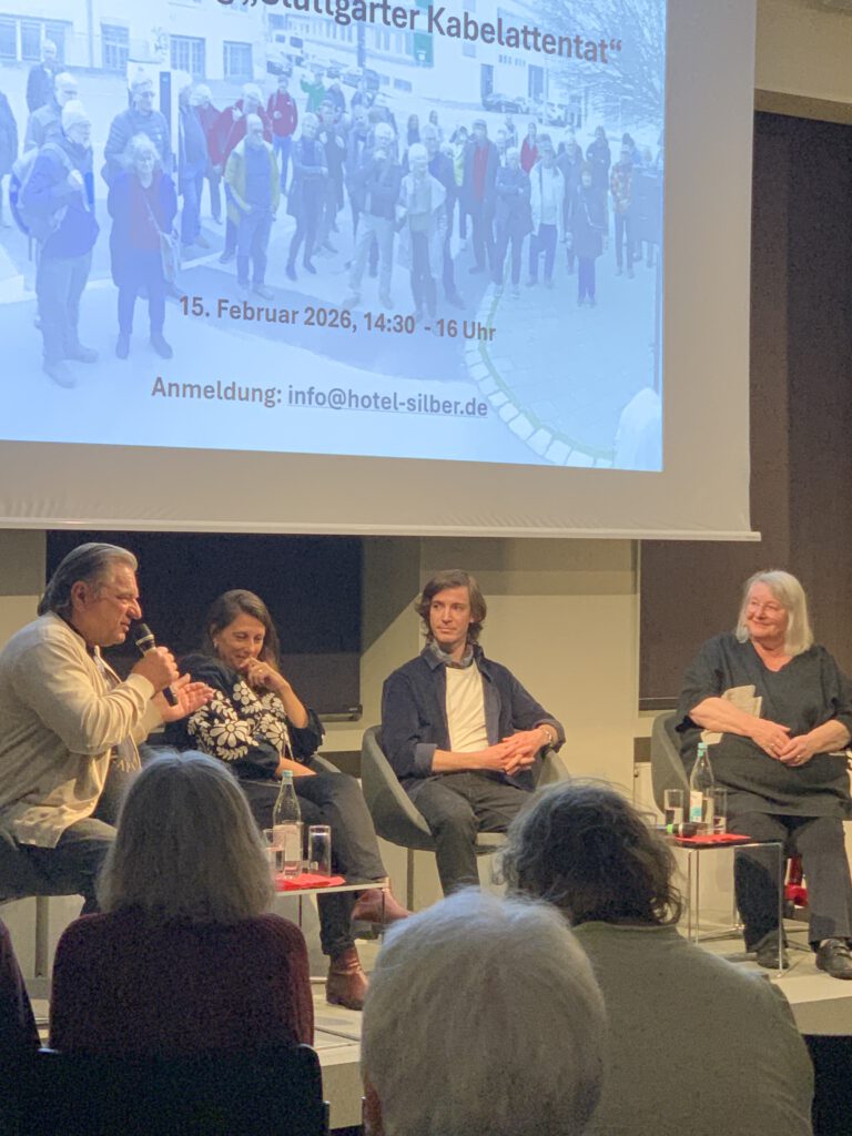 SWR Unternehmenssprecherin Hannah Basten, Stolperstein-Putzpate Benedikt Waldmann und eine Vertreterin der Koordinierungsstelle Erinnerungskultur der Stadt Stuttgart diskutieren über eine zeitgemäße Form der Erinnerung an das „Stuttgarter Kabelattentat“.