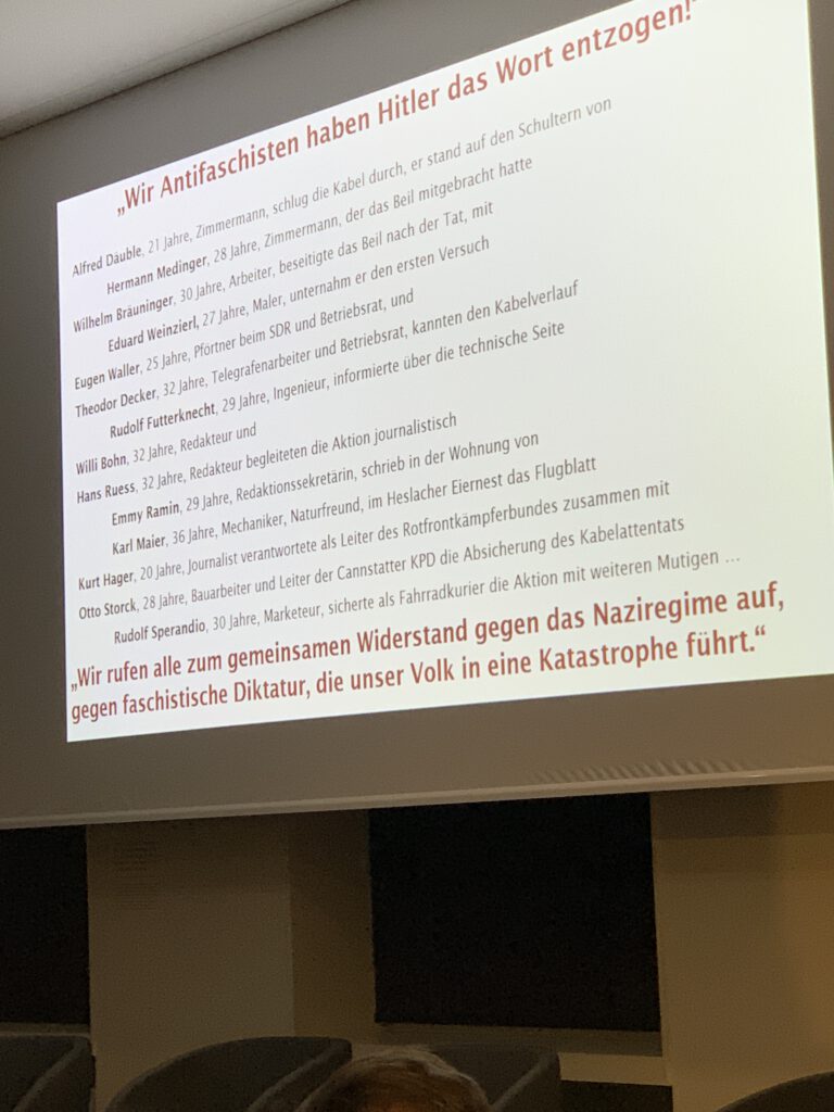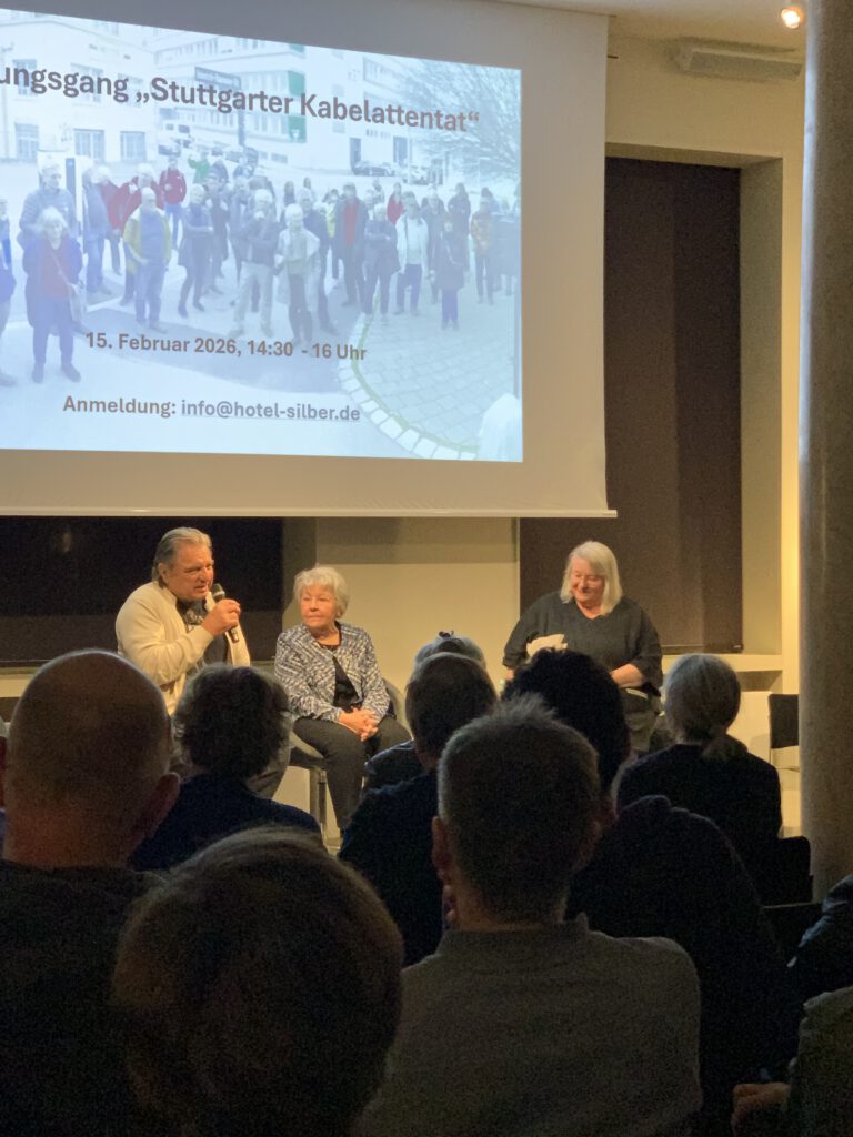 Gudrun Greth, Stolperstein-Initiative Stuttgart-Ost, und Ebbe Kögel, Allmende Stetten/ David-Pfeffer-Geschichtswerkstatt, führen seit Jahren Gedenkgänge zum „Stuttgarter Kabelattentat“ durch, bei denen sie an die Initiatoren, die direkten und die indirekten Tatbeteiligten erinnern. In Kooperation mit dem SWR förderte die Forschung zahlreiche Filme und Hörausnahmen aus dem historischen SDR-Archiv zutage, in die an diesem Abend erstmals Einblick gegeben wird: Vor über 50 Jahren aufgenommene und weitgehend in Vergessenheit geratene Originalfilme und -Interviews mit unterschiedlichen Beteiligten am „Stuttgarter Kabelattentat“ wie Willi Bohn, Alfred Däuble, Hermann Medinger, Käte Medinger – interviewt von Karl Ebert, SDR, aus dem historischen SDR-Archiv bringen einen unmittelbaren Eindruck von der konspirativ geplanten und durchgeführten Widerstandsaktion und den Folgen für die Beteiligten. Neben den O-Tönen der Zeitzeugen sprechen Gudrun Greth und Ebbe Kögel auf dem Podium mit Nachkommen von Tatbeteiligten wie Gretl Pertuch, Tochter von Eugen Waller über die Folgen für die Familien, die heutige Bedeutung und die Erwartungen an eine angemessene Erinnerung. SWR Unternehmenssprecherin Hannah Basten, Stolperstein-Putzpate Benedikt Waldmann und eine Vertreterin der Koordinierungsstelle Erinnerungskultur der Stadt Stuttgart diskutieren über eine zeitgemäße Form der Erinnerung an das „Stuttgarter Kabelattentat“.