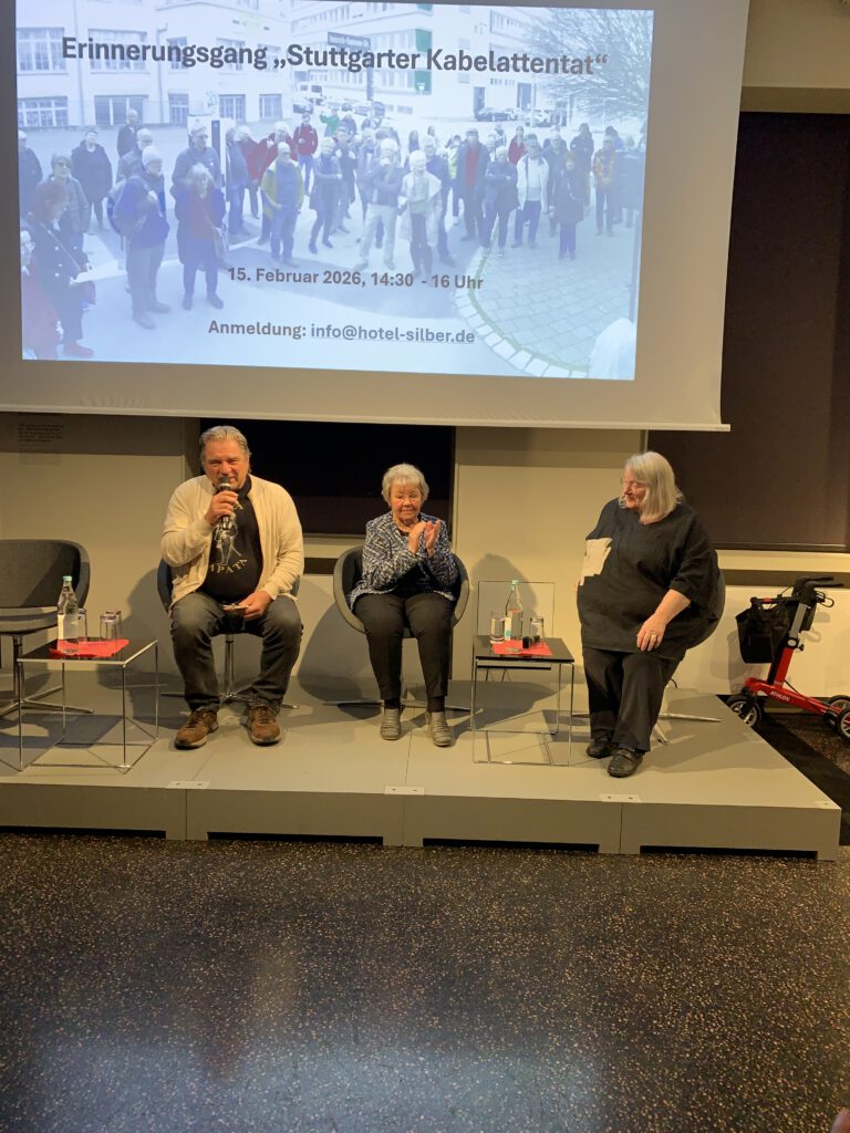 Gudrun Greth, Stolperstein-Initiative Stuttgart-Ost, und Ebbe Kögel, Allmende Stetten/ David-Pfeffer-Geschichtswerkstatt, führen seit Jahren Gedenkgänge zum „Stuttgarter Kabelattentat“ durch, bei denen sie an die Initiatoren, die direkten und die indirekten Tatbeteiligten erinnern.