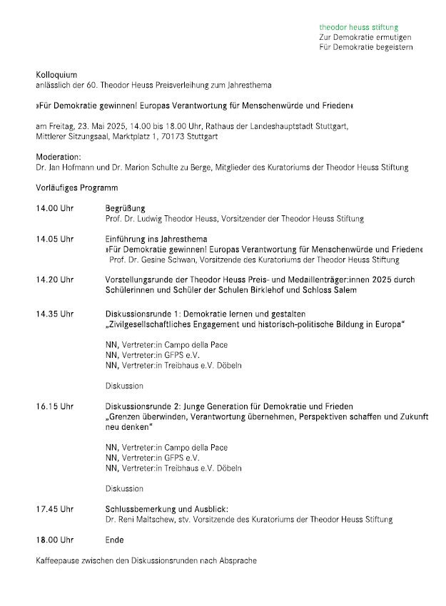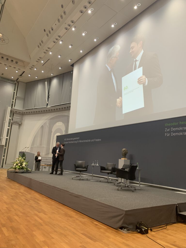 Das gab die überparteiliche Theodor Heuss Stiftung in Stuttgart bekannt. Die Preisverleihung steht unter dem Jahresthema: „Für Demokratie gewinnen! Europas Verantwortung für Menschenwürde und Frieden“.