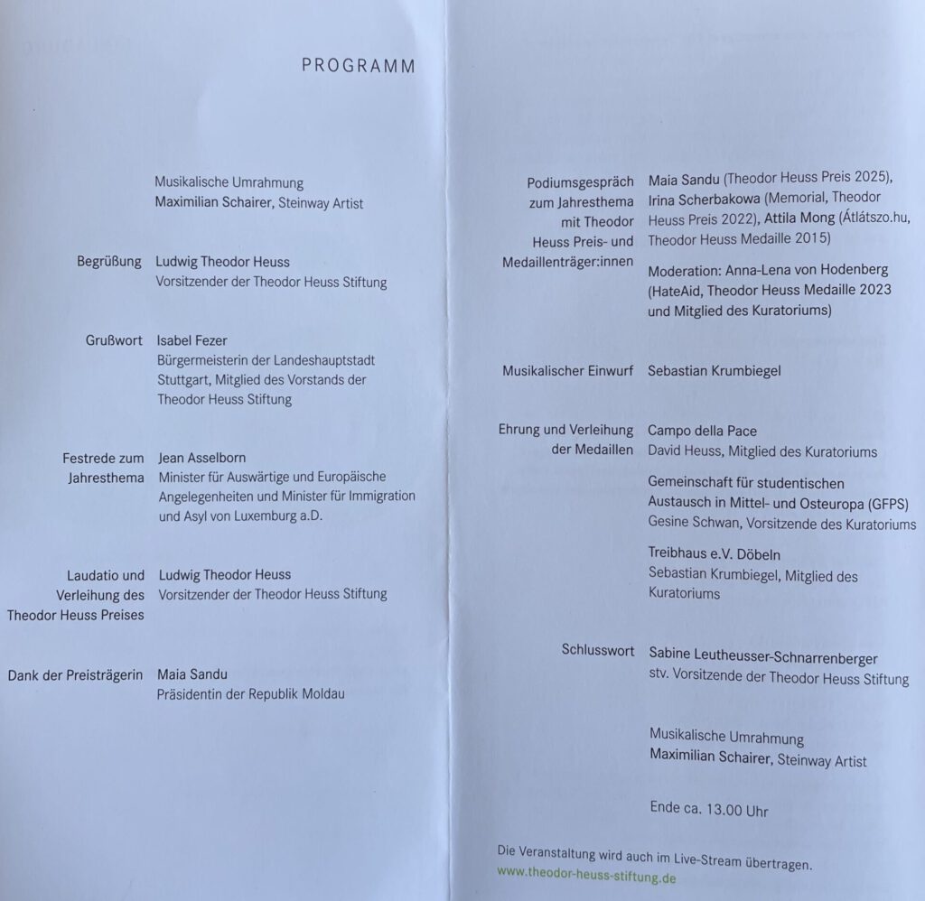 „Theodor Heuss Medaillen 2025 für herausragendes demokratisches Engagement gehen an die Initiative Campo della Pace, an die Gemeinschaft für studentischen Austausch in Mittel- und Osteuropa und an das Treibhaus Döbeln.“