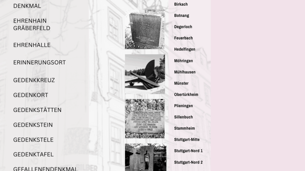 Über 190 Orte, die an die nationalsozialistische Zeit in Stuttgart erinnern, werden auf der neuen Webseite dokumentiert. An wen wird erinnert? Wann wurde der Ort errichtet und wer tat das? Die Webseite ist zunächst einmal eine Auflistung dieser vielen Orte, die in allen Stuttgarter Stadtbezirken zu finden sind. Die heutige Stadtgesellschaft erhält mit der Webseite die Möglichkeit, sich an diese zum Teil schon vergessenen Orte zu erinnern, sie aufzusuchen, vielleicht auch einzelne kritisch zu hinterfragen und zu verändern.