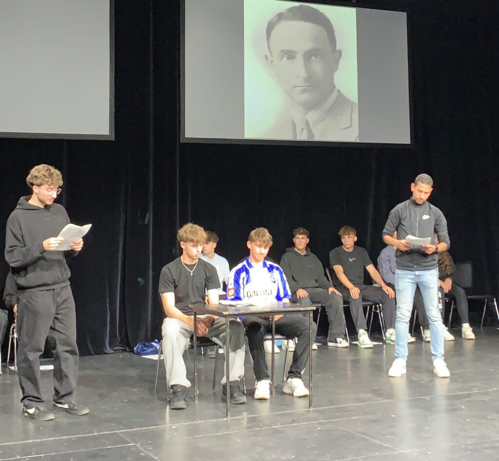 Gemeinsam mit dem Theaterpädagogen Manoel Tavares erarbeiten die Schüler/innen der Klasse BK-Sport 2B (BKS2B) der Cotta-Schule ein Theaterstück zum Gedenken an den ehemaligen jüdischen Trainer der Stuttgarter Kickers Fritz Kerr.